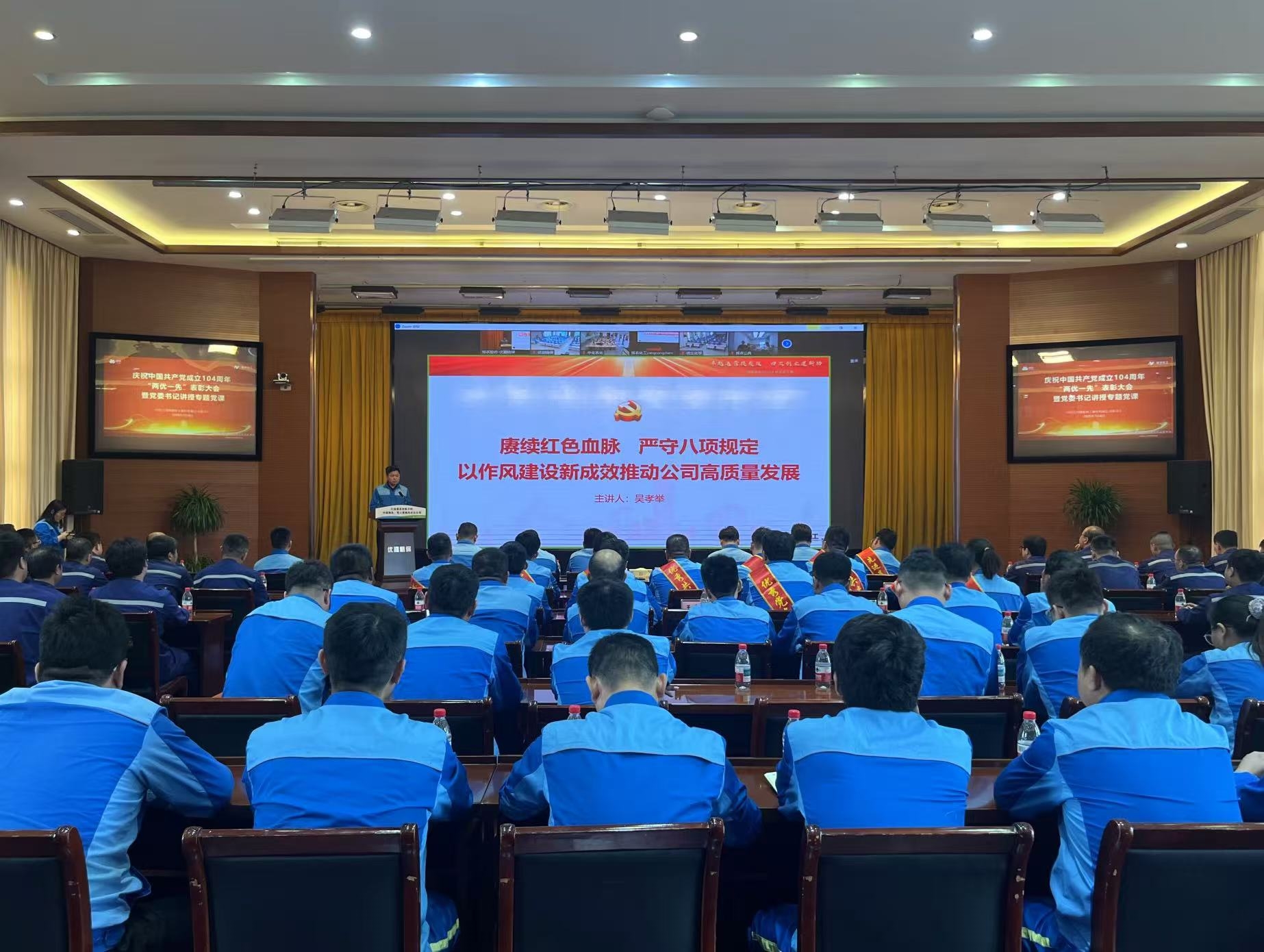 ? ? ? ?為深入學(xué)習(xí)貫徹習(xí)近平新時代中國特色社會主義思想和黨的二十大和二十屆二中、三中全會精神,7月4日,揚(yáng)農(nóng)股份黨委召開慶祝中國共產(chǎn)黨成立104周年“兩優(yōu)一先”表彰大會暨黨委書記講授專題黨課,表彰了一年來涌現(xiàn)出的先進(jìn)基層黨組織、優(yōu)秀共產(chǎn)黨員和優(yōu)秀黨務(wù)工作者。公司黨委書記、總經(jīng)理吳孝舉講授題為“賡續(xù)紅色血脈 嚴(yán)守八項(xiàng)規(guī)定,以作風(fēng)建設(shè)新成效推動公司高質(zhì)量發(fā)展”學(xué)習(xí)教育專題黨課。受表彰對象、各公司黨政中層、主任助理及以上管理人員、專兼職黨務(wù)工作者、黨員及入黨積極分子代表和員工代表706人參會,會議由公司黨委副書記、紀(jì)委書記陸東升主持。會議伊始,黨群工作部副主任周曙傳達(dá)了中國中化慶祝中國共產(chǎn)黨成立104周年暨“兩優(yōu)一先”表彰大會會議精神。