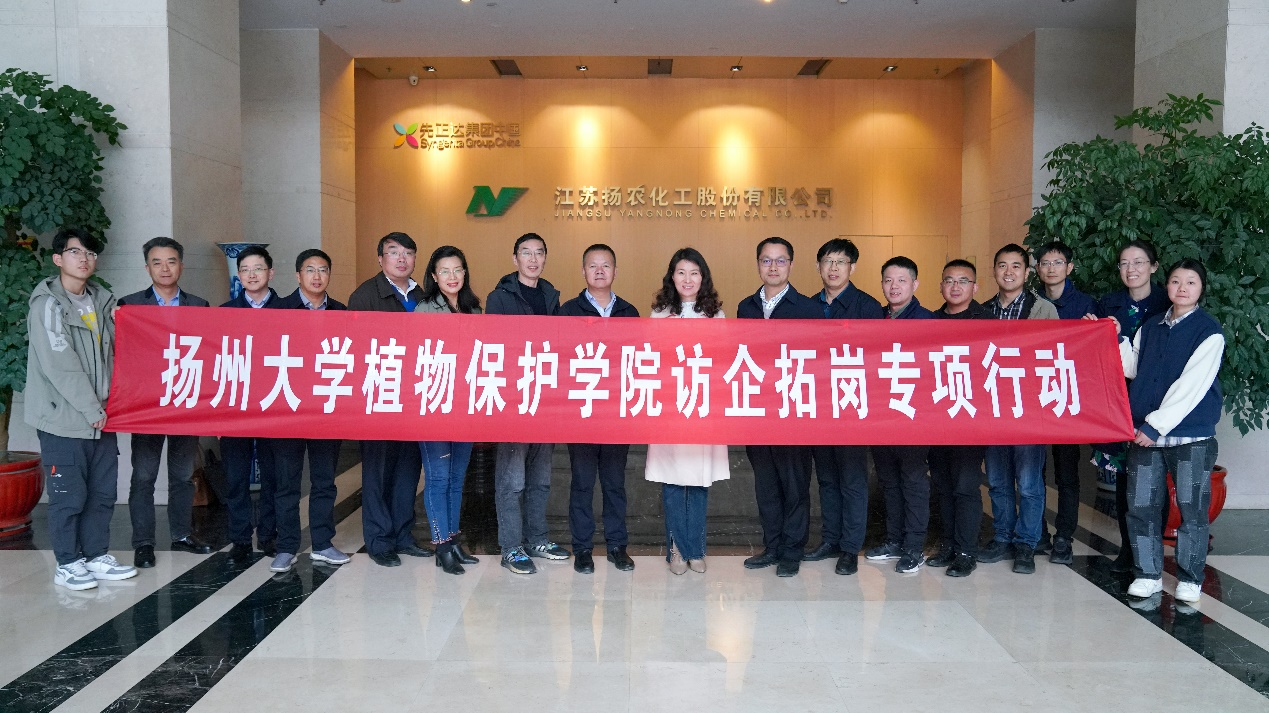 4月25日,揚(yáng)州大學(xué)植物保護(hù)學(xué)院黨委書記侯燕、院長楊國慶攜院內(nèi)骨干教師、學(xué)生代表一行12人赴我司開展“訪企拓崗”專項(xiàng)行動(dòng)。揚(yáng)農(nóng)股份紀(jì)委書記、副總經(jīng)理姜友法出席活動(dòng),科技管理部相關(guān)人員參加了交流。