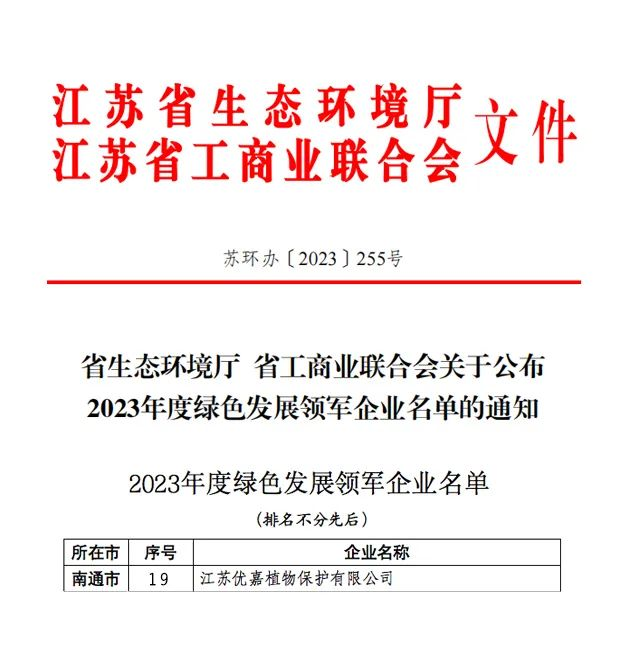 10月上旬,江蘇省生態(tài)環(huán)境廳與江蘇省工商業(yè)聯(lián)合會聯(lián)合發(fā)布“2023年度綠色發(fā)展領軍企業(yè)”名單,江蘇優(yōu)嘉植物保護有限公司成為南通唯一一家入選企業(yè),這也代表著公司成為了省級引領植保行業(yè)綠色發(fā)展的示范性標桿企業(yè)。