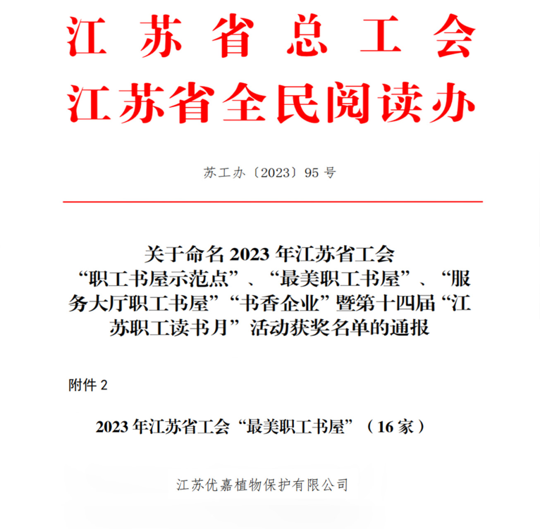 12月18日,江蘇省總工會(huì)、江蘇省全民閱讀辦聯(lián)合印發(fā)通報(bào),授予全省16家單位“2023年江蘇省工會(huì)‘最美職工書屋’”稱號(hào),子公司優(yōu)嘉植保獲得該項(xiàng)榮譽(yù)。