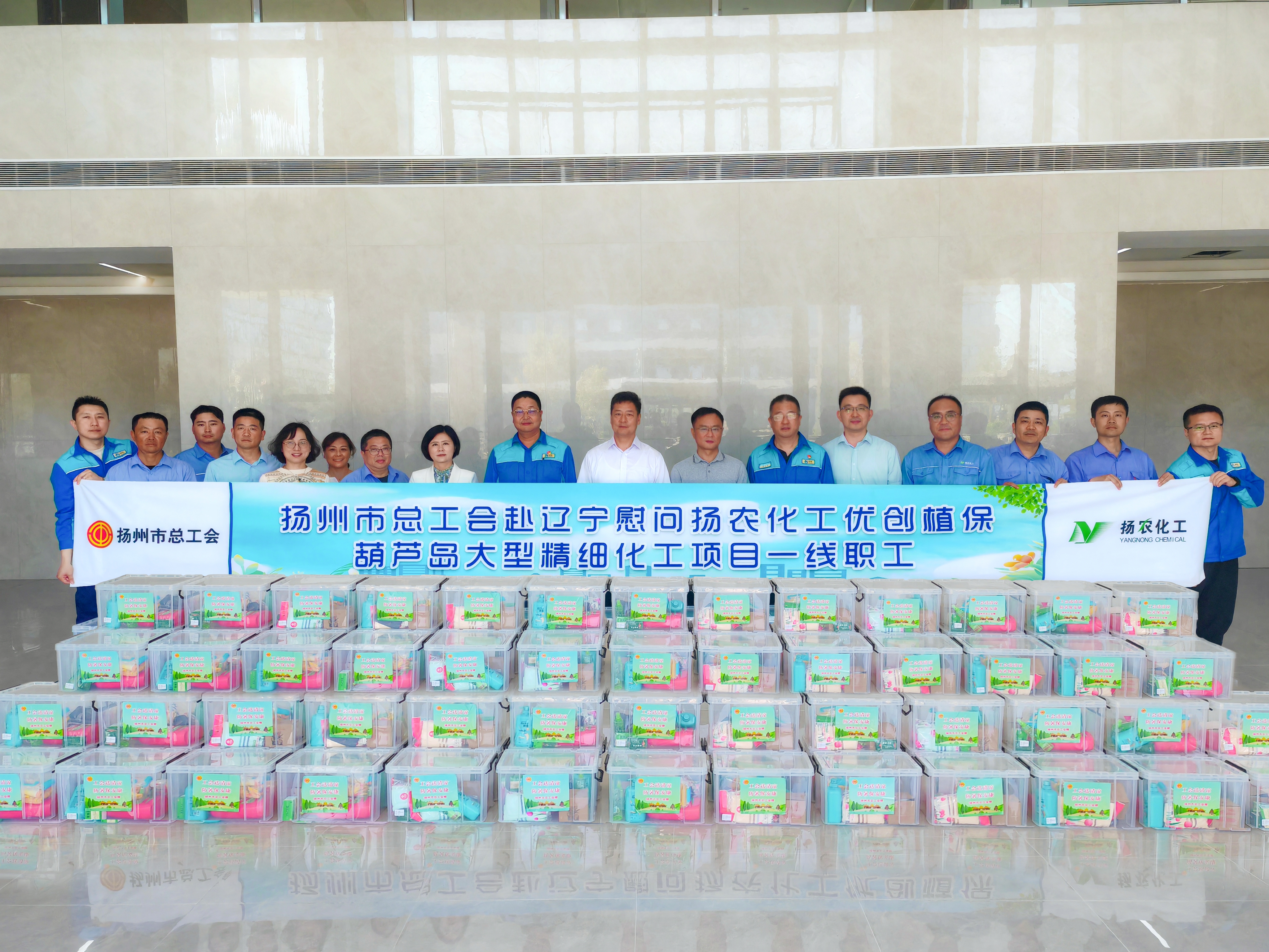 ? ? ? ?7月22日,由揚(yáng)州市總工會(huì)黨組書記、副主席蔣元峰,市稅務(wù)局黨委委員、副局長(zhǎng)張耀斌,市總工會(huì)黨組成員、副主席賈萍等組成的慰問團(tuán)赴我司遼寧優(yōu)創(chuàng)植保葫蘆島大型精細(xì)化工項(xiàng)目現(xiàn)場(chǎng)親切慰問生產(chǎn)調(diào)試一線員工,公司副總經(jīng)理、優(yōu)創(chuàng)植保總經(jīng)理王明坤,揚(yáng)農(nóng)股份工會(huì)主席張慶平陪同接待。