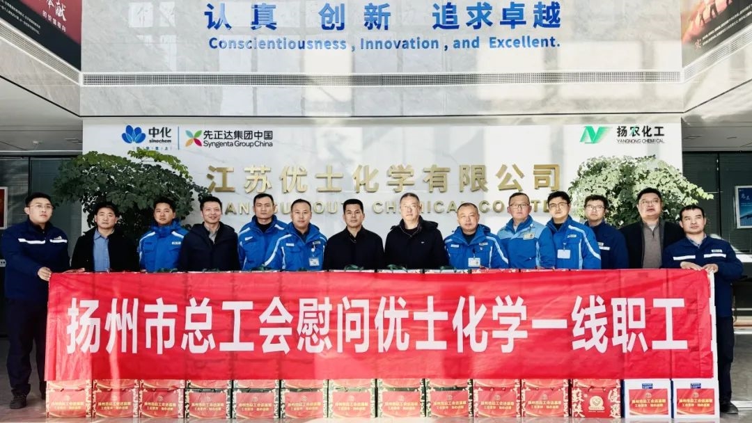 ? ? ? ?1月16日,揚(yáng)州市總工會(huì)副主席韓士軍一行來到揚(yáng)農(nóng)股份優(yōu)士化學(xué)開展春節(jié)慰問活動(dòng),揚(yáng)農(nóng)股份工會(huì)主席張慶平、優(yōu)士化學(xué)副總經(jīng)理蘇恩鵬等領(lǐng)導(dǎo)參加了慰問活動(dòng)。