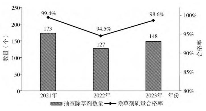 ? ? ? ?除草劑產(chǎn)品專項抽查是主要針對敵草快等滅生性除草劑中添加百草枯等違法違規(guī)行為開展的專項監(jiān)管。2021—2023年共專項抽查193個敵草快、草甘膦、草銨膦等滅生性除草劑產(chǎn)品(含復(fù)配制劑),其中檢出含百草枯的0個。這表明全面清查回收庫存百草枯和實行百草枯生產(chǎn)出口監(jiān)管后,打擊百草枯非法添加問題已卓有成效。此外,近3年專項抽查中出現(xiàn)其他質(zhì)量不合格情況的除草劑產(chǎn)品有6個,合格率為96.9%,低于例行抽查合格率98.3%。