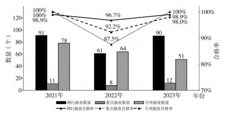 ? ? ? ?除草劑市場監(jiān)督抽查按照“雙隨機、一公開”原則,采用例行抽查、重點抽查和專項抽查相結(jié)合的方式開展。從數(shù)量上來看,2021—2023年每年該3類抽查方式的數(shù)量比例相對穩(wěn)定(同一樣品同時屬于專項抽查和重點抽查的,重復(fù)計算);從抽查結(jié)果來看,2022年重點抽查和專項抽查合格率明顯偏低,分別只有87.5%和92.2%,2023年二者則分別上升到100%和98%(圖2)。這充分說明,以問題為導(dǎo)向開展重點抽查和專項抽查,綜合提高抽查針對性,有助于推動農(nóng)藥市場規(guī)范化,提升抽檢工作成效。