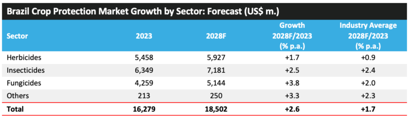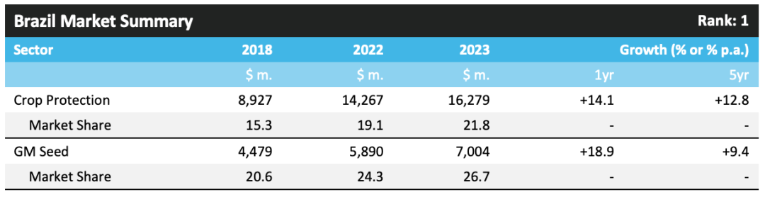 ? ? ? ?2023 年,巴西作物保護市場價值增長了 14.1%,達到 162.79 億美元。這種強勁的增長水平是由 2022 年 7 月至 2023 年 6 月農(nóng)業(yè)年度期間的高農(nóng)藥價格、持續(xù)強勁的農(nóng)業(yè)經(jīng)濟、主要作物種植面積增加以及北部地區(qū)相對較高的害蟲壓力所驅(qū)動,在北部地區(qū),潮濕的天氣有利于疾病的發(fā)展。對于大豆來說,該地區(qū)受益于對可出口產(chǎn)品的強勁需求,特別是來自中國的需求。此外,巴西雷亞爾的貶值增加了巴西大豆的吸引力。巴西玉米種植面積也有所增加,因為種植者希望利用高玉米交易價格獲利。