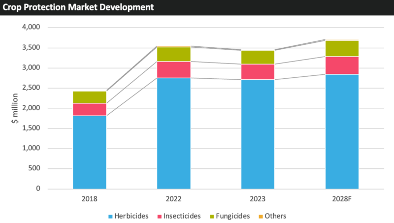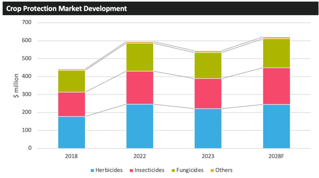 ? ? ? ?對于巴西來說,2024 農(nóng)業(yè)年度(2023 年 7 月至 2024 年 6 月)農(nóng)用化學品價格下降是 2024 年市場價值的一個關(guān)鍵負面因素,而較低的商品價格在一定程度上阻礙了種植者的支出。該國的作物保護市場在 2024 年估計下降了 9%,降至 148.15 億美元,這是自 2017 年以來以美元計價的首次價值下降。