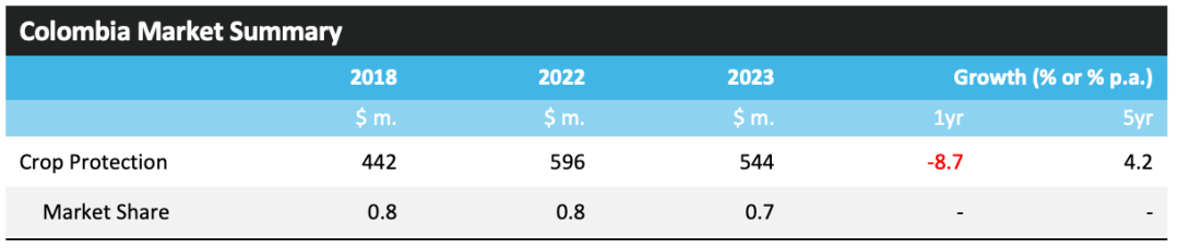 ? ? ? ?該國對谷物和油料種子的關(guān)注較少,而傾向于水果和蔬菜,這意味著種植者對主要農(nóng)作物商品的價格波動不太敏感。2023年,哥倫比亞作物保護市場的價值下降了 8.7%,總計 5.44 億美元。