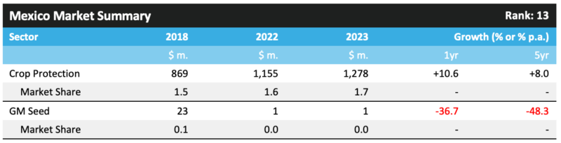 ? ? ? ?2023 年,墨西哥的作物保護市場增長了 10.6%,達到 12.78 億美元。在這個水平上,就作物保護銷售額而言,該國在 2023 年排名第十三。
