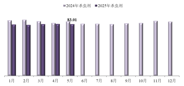 ? ? ? ?5月,殺蟲(chóng)劑價(jià)格指數(shù)為83.01,環(huán)比下跌0.24%,同比下跌4.76%。監(jiān)測(cè)在內(nèi)的37種殺蟲(chóng)劑產(chǎn)品中,加權(quán)平均成交價(jià)格環(huán)比上漲的17種,環(huán)比持平的1種,環(huán)比下跌的18種;加權(quán)平均成交價(jià)格同比上漲的11種,同比下跌的26種。